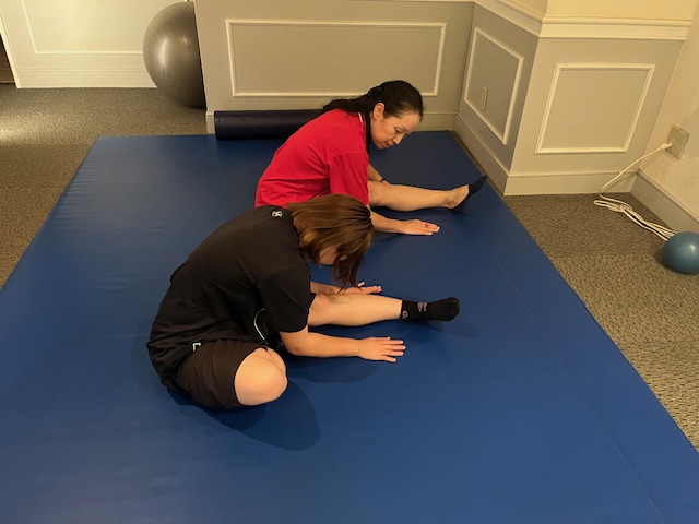 まずは、体を柔らかくするための準備運動とストレッチマシンを使った簡単・効果的なストレッチの説明を行います。ストレッチコーナーでは、常にストレッチのDVD映像が流れています。
